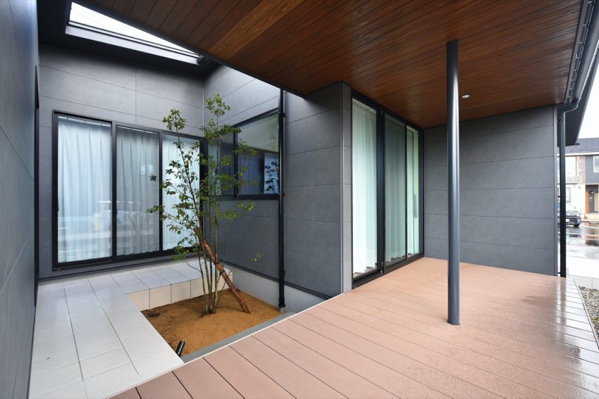 中庭を囲むように建物をコの字型に配置。中庭部分にタイルテラスを、コの字の開口部分を屋根とウッドデッキでつなげば、家の中と外の境界がより曖昧に。