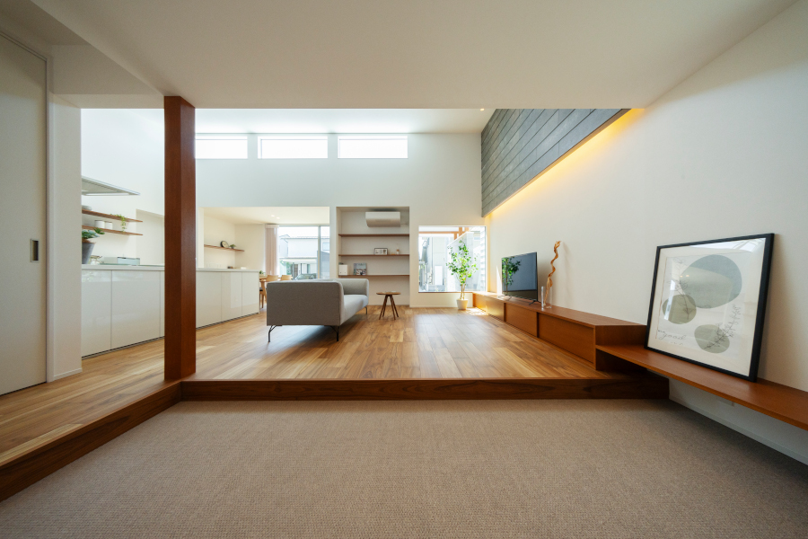 床を1段掘り下げたサンクンリビングは、リビングの中にありながらも別空間のよう。段差があることで“自分の場所”という意識が生まれ、子どもは安心しておもちゃを広げて遊べます。