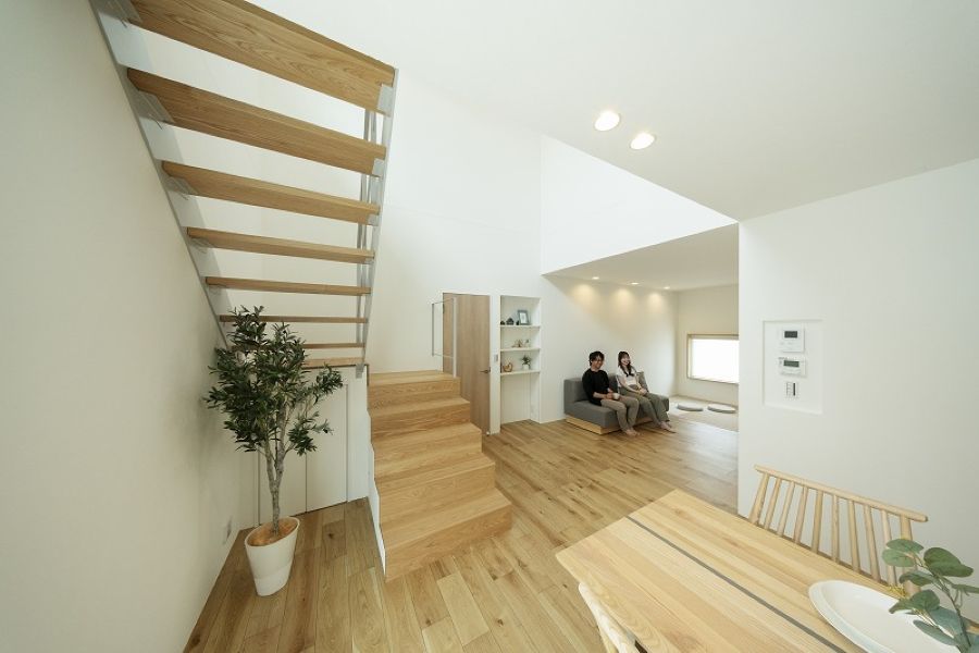 リビングに階段があるだけで、子どもはそこを遊び場に変えてしまいます。段に座って本を読んだり、階段下に潜り込んだり。お人形と一緒にごっこ遊びをはじめれば、階段1段1段がアパートメントの一室に。