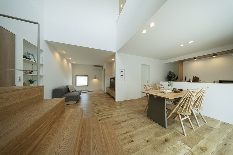 吹き抜けや窓の配置で広がり感を出しつつも、家族でくつろぐリビングは動線上には配置せず奥に設けて、ゆったりと落ち着ける空間に。