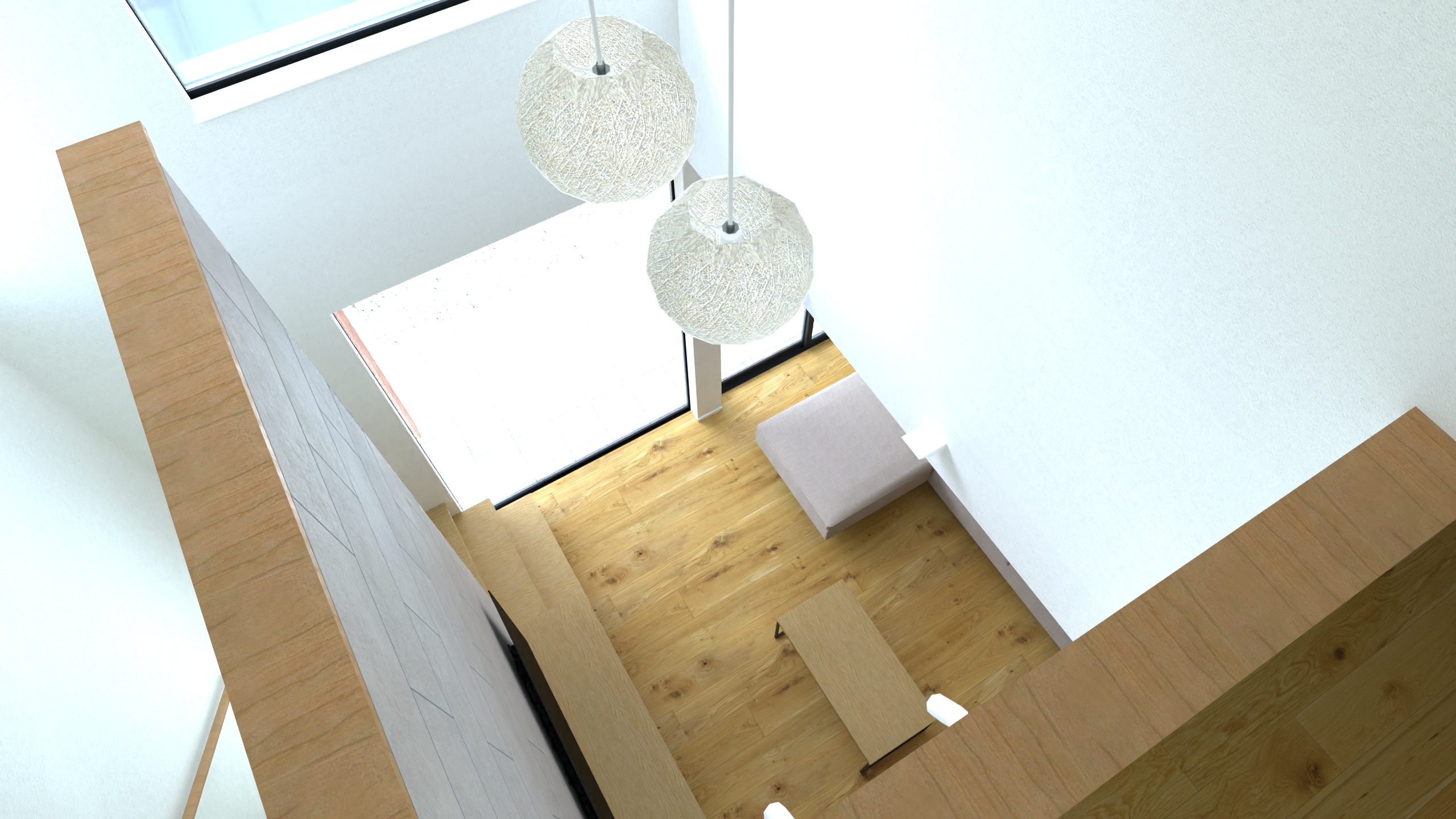 大きな窓と吹き抜けで光があふれ、家族みんなが心地よく過ごせる開放的な空間です。
