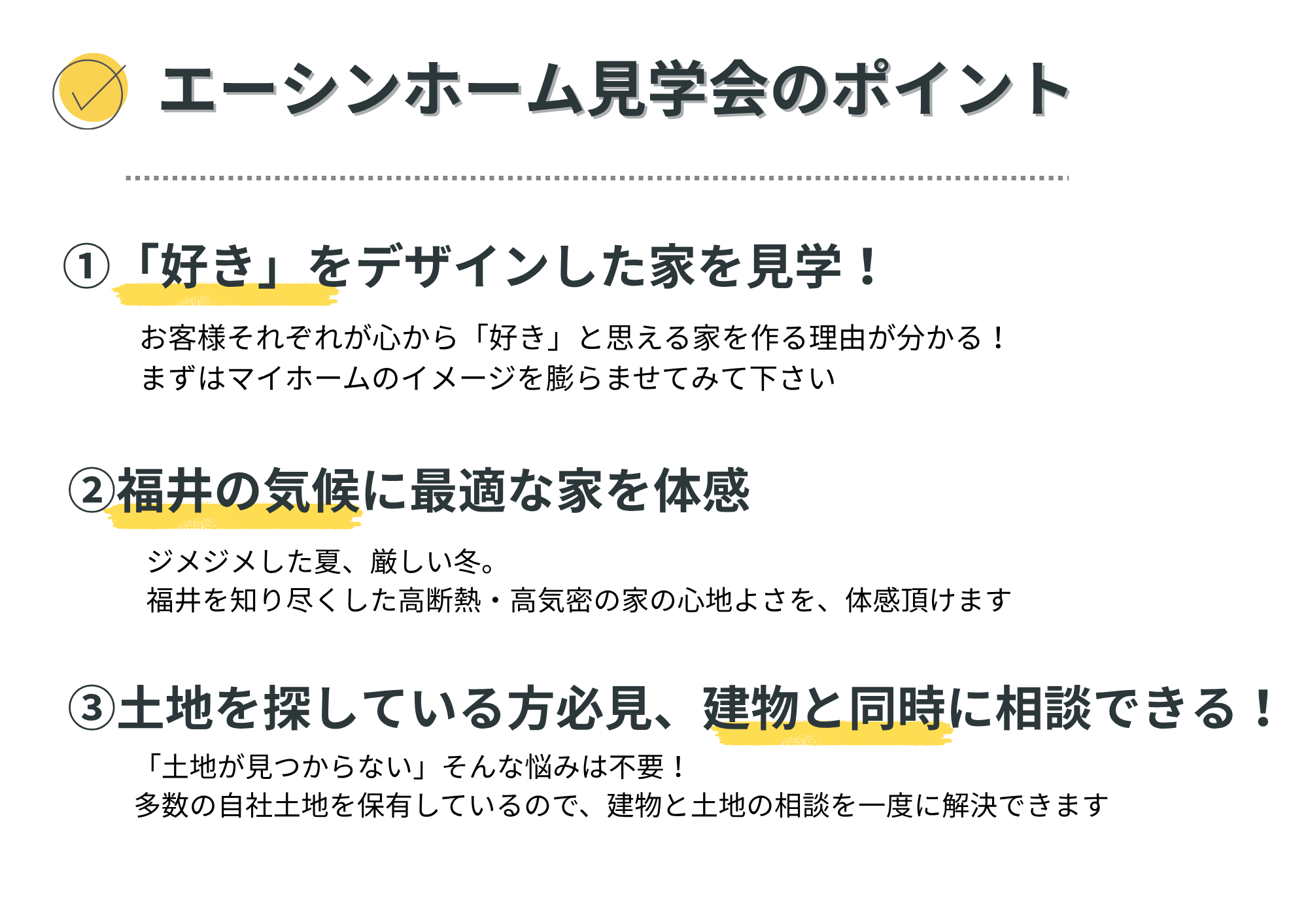 大型住宅地エーシンガーデンをはじめ、人気のエリアに自社物件を多数保有しているからこそ、土地探しから家づくりまで一貫してお任せいただけます。土地探しと家づくりが並行して行えるため、理想の暮らしを叶えられます。
