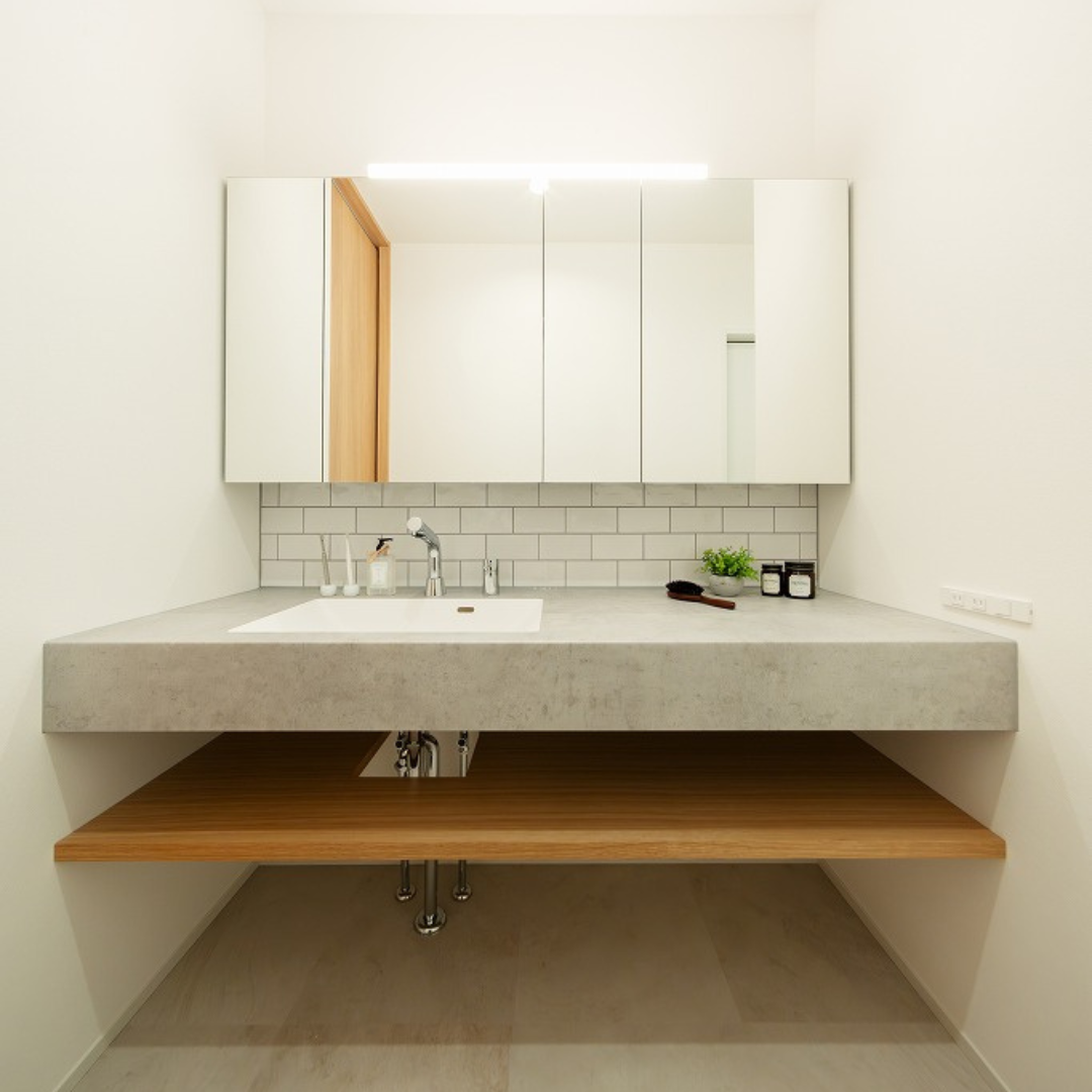出かける準備で忙しい朝、水回りが慌ただしくても、その気配がLDKに届かないようあえて分けて配置。