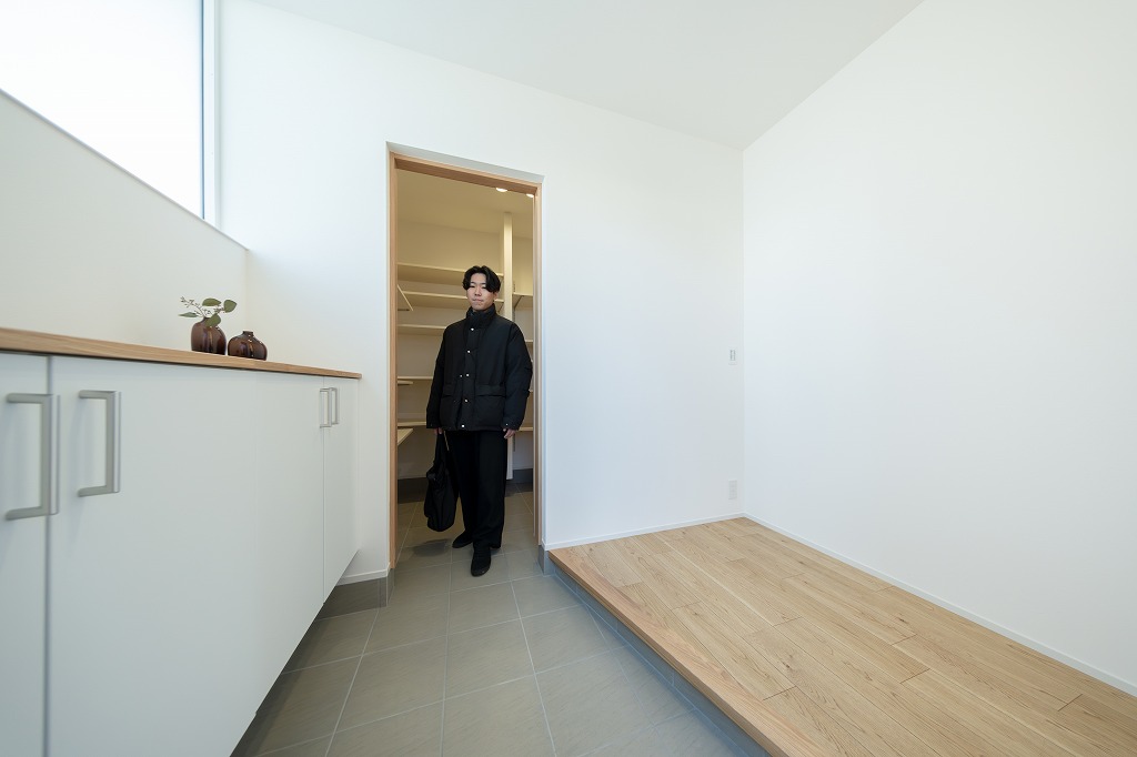 家族用玄関には大容量収納を設け、さらにそのまま「手洗い・お風呂」へ直行できる便利な動線設計です。