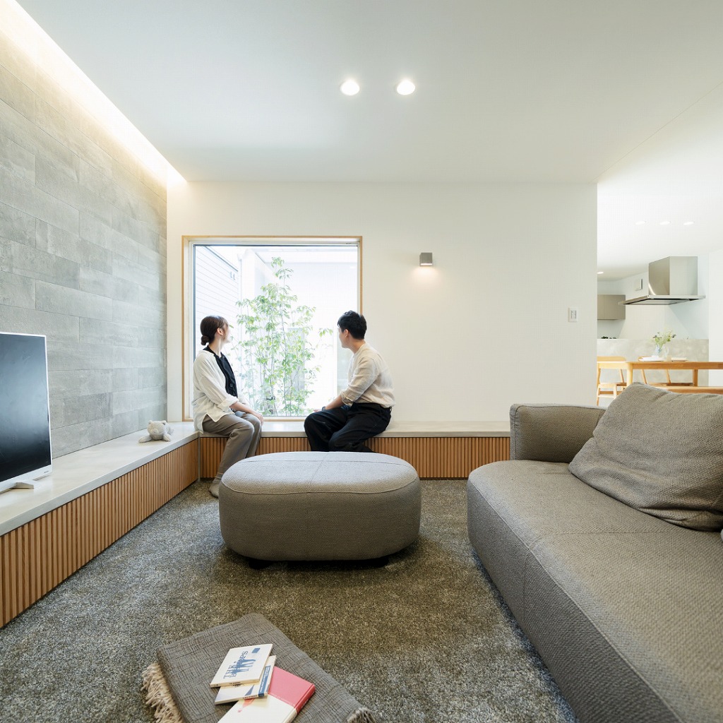 こもり感のあるサンクンリビングやカウンター、2階のお空リビングなど居場所が沢山ある住まいです。