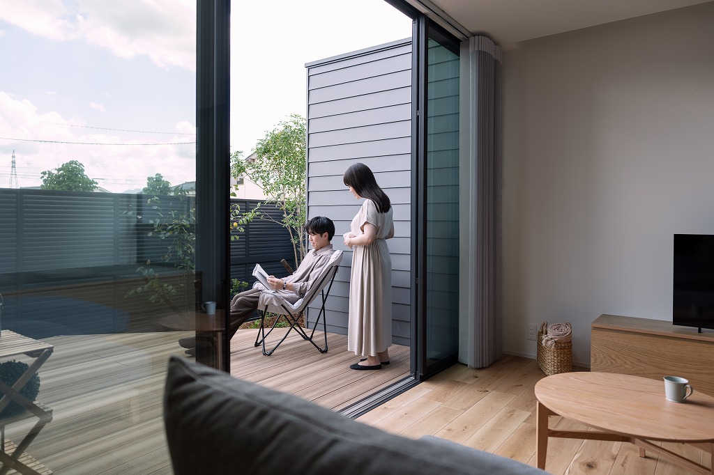 リビングすぐ横にはウッドデッキを設け、床を連続させることで見た目以上の広がり感を演出。