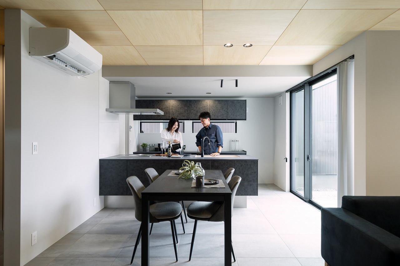 2人並んで料理ができるキッチン。色は黒やグレーでまとめかっこよさを演出しました。