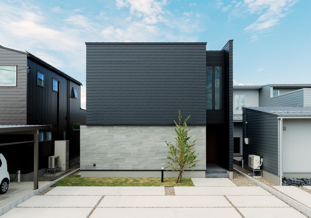 アクセントタイルと板金を使用し、無機質でスタイリッシュに仕上げた外観。