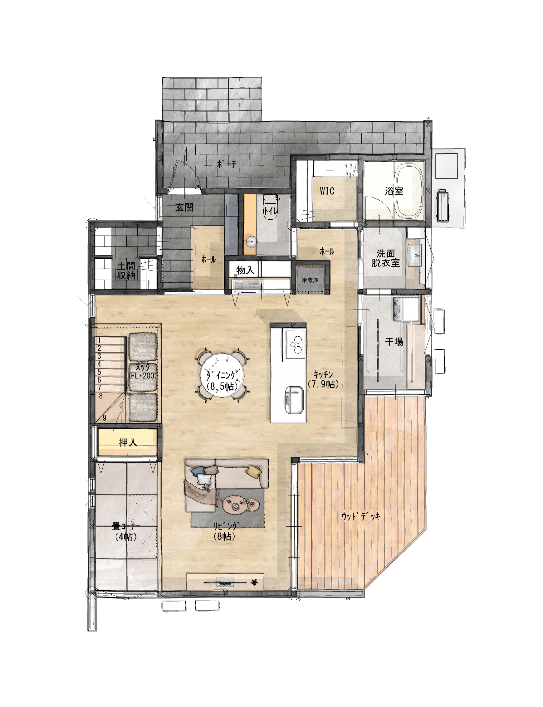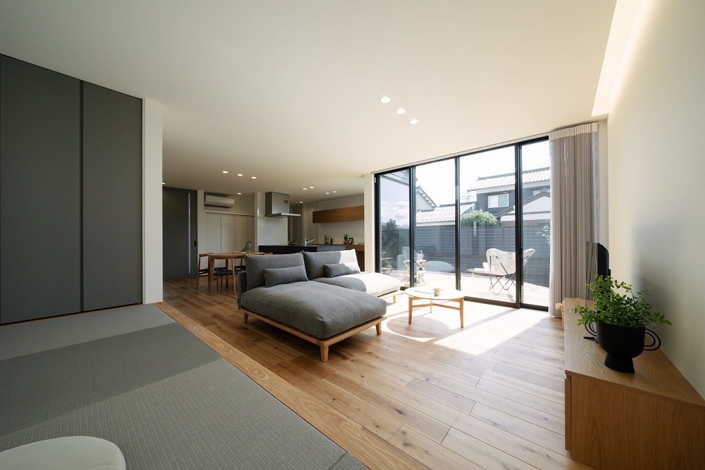 リビングはあえて入口から遠い位置に配置することで、静かにホッと一息つける空間に。 小上がりの畳コーナーやウッドデッキなど沢山の居場所も設けました。
