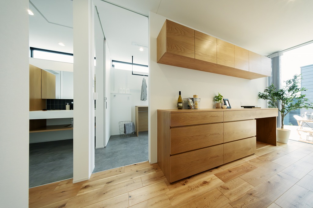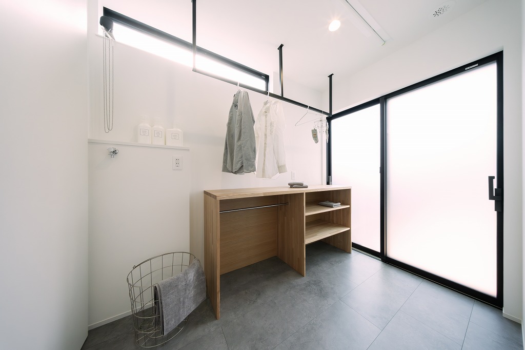 カウンター付の家事室では、洗って干して畳むが1か所で完結します。 リビング横にあるウッドデッキへ出れるので外干しも可能です。