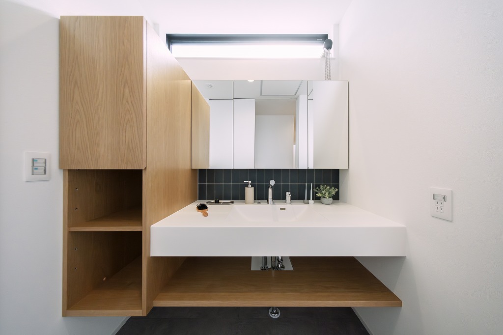 黒のタイルと木目の対比が美しい、造作の洗面化粧台。