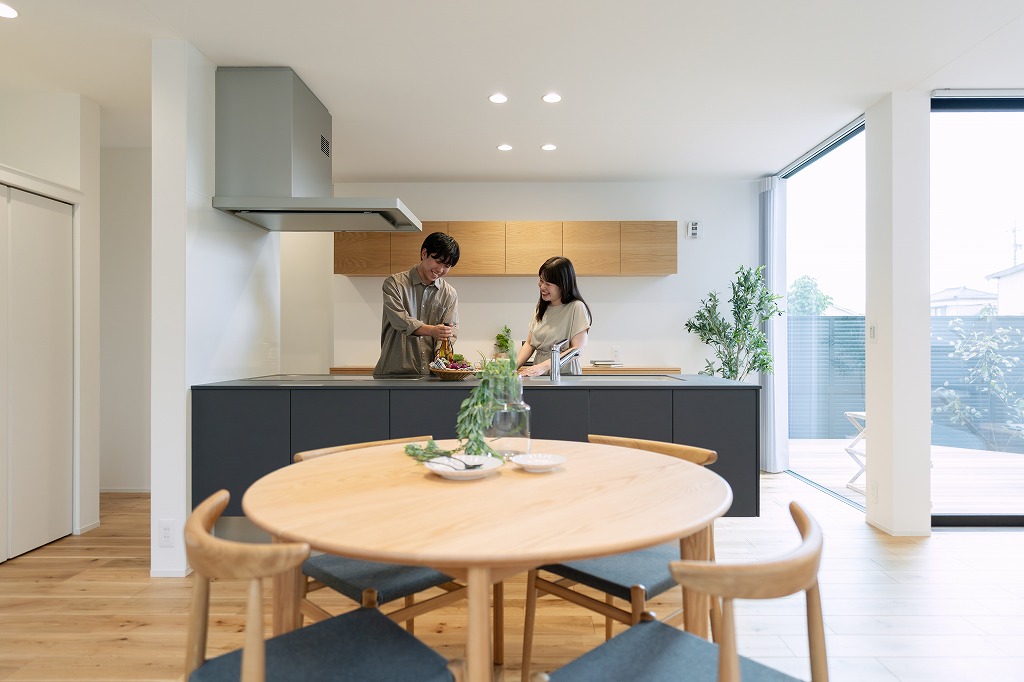 フルフラットのキッチンは作業スペースもしっかり確保し、広々使えます。 ダイニングを目の前に配置しているので、料理の配膳や後片付けもラクにできます。