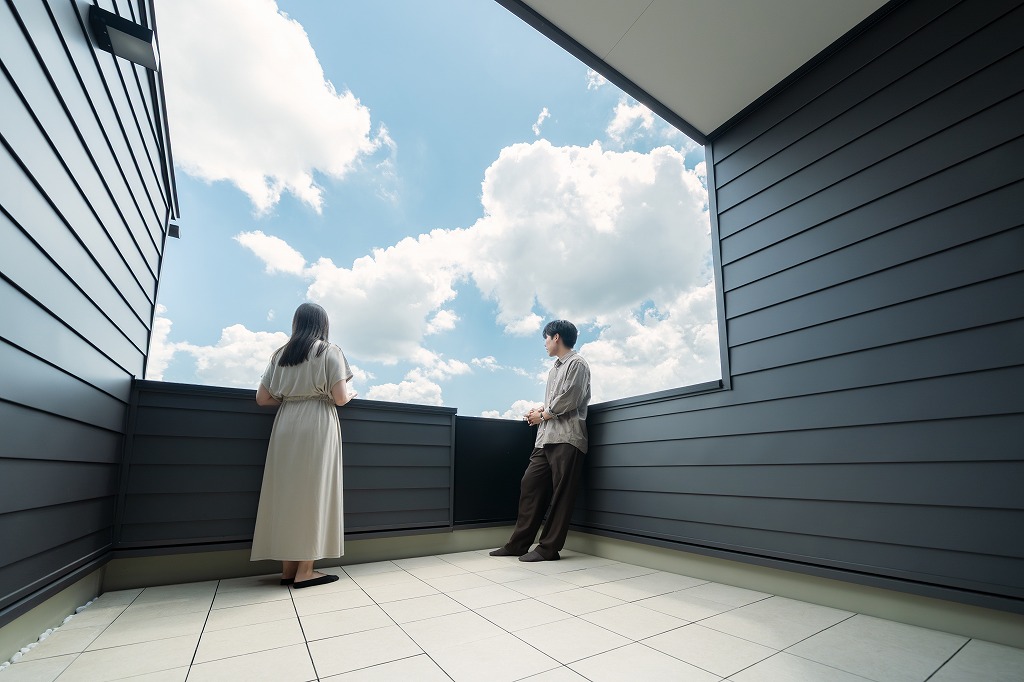 階段を上ったすぐ先にはタイルデッキを設けました。 晴れている日には布団を干したり、夜は晩酌をしたり…多様な使い方ができますね。