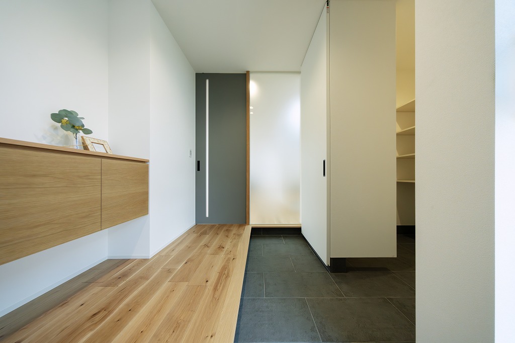 入ってすぐの壁をすりガラスにすることで、抜け感を感じる玄関。 土間収納も設けたので、玄関周りもすっきりします。